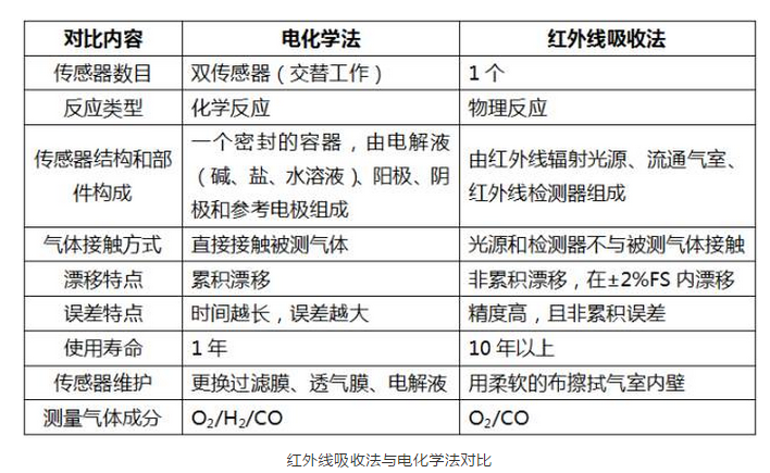 CO氣體檢測的主要方法有:紅外線吸收法、電化學法、電氣法(熱導式和半導式)、色譜法,目前CO氣體濃度在線檢測通常使用紅外線吸收法、電化學法。
