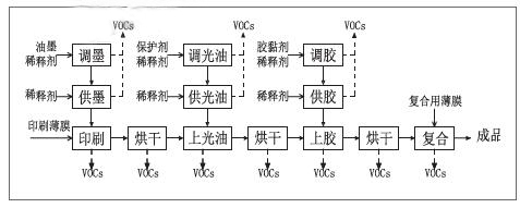 VOCs來源和排放途徑主要有:原輔材料調配;供料(油墨、光油或膠黏劑);印刷、上膠、上光油、復合等工藝過程;烘干及設備清洗等過程中溶劑的揮發(fā),其中揮發(fā)量最大的為烘干,其次為供料過程。在供料過程中,為保證黏度要求,槽中的物料通過槽子底部的孔流入供料桶中,添加稀釋劑后再由泵打入供料槽中,因此處于不斷循環(huán)狀態(tài)。